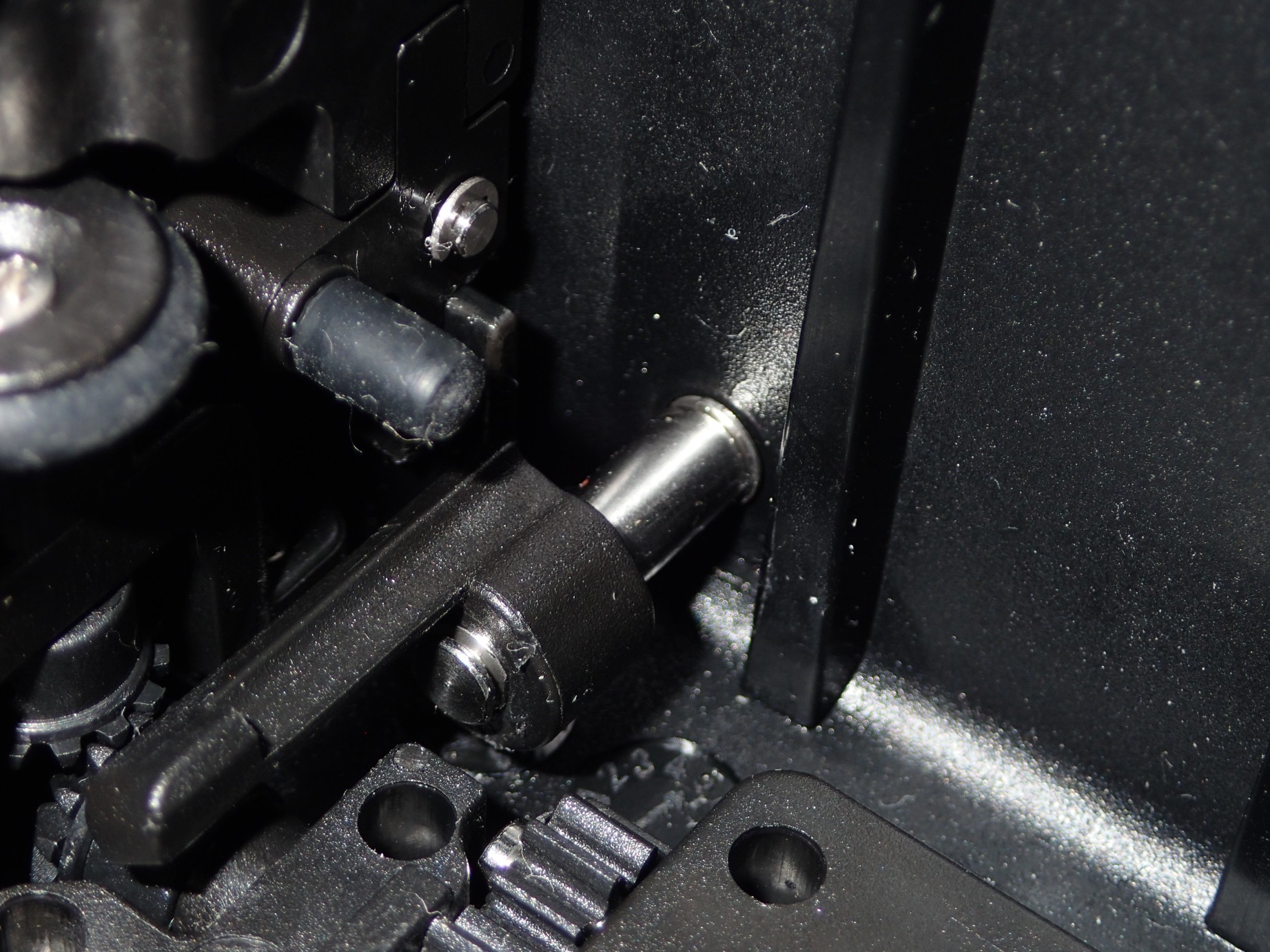 ばねがある場合は以下のように、2mm位の隙間が空いた状態になっていて、そこからシャッターレバーを引きこまなければいけなかった。