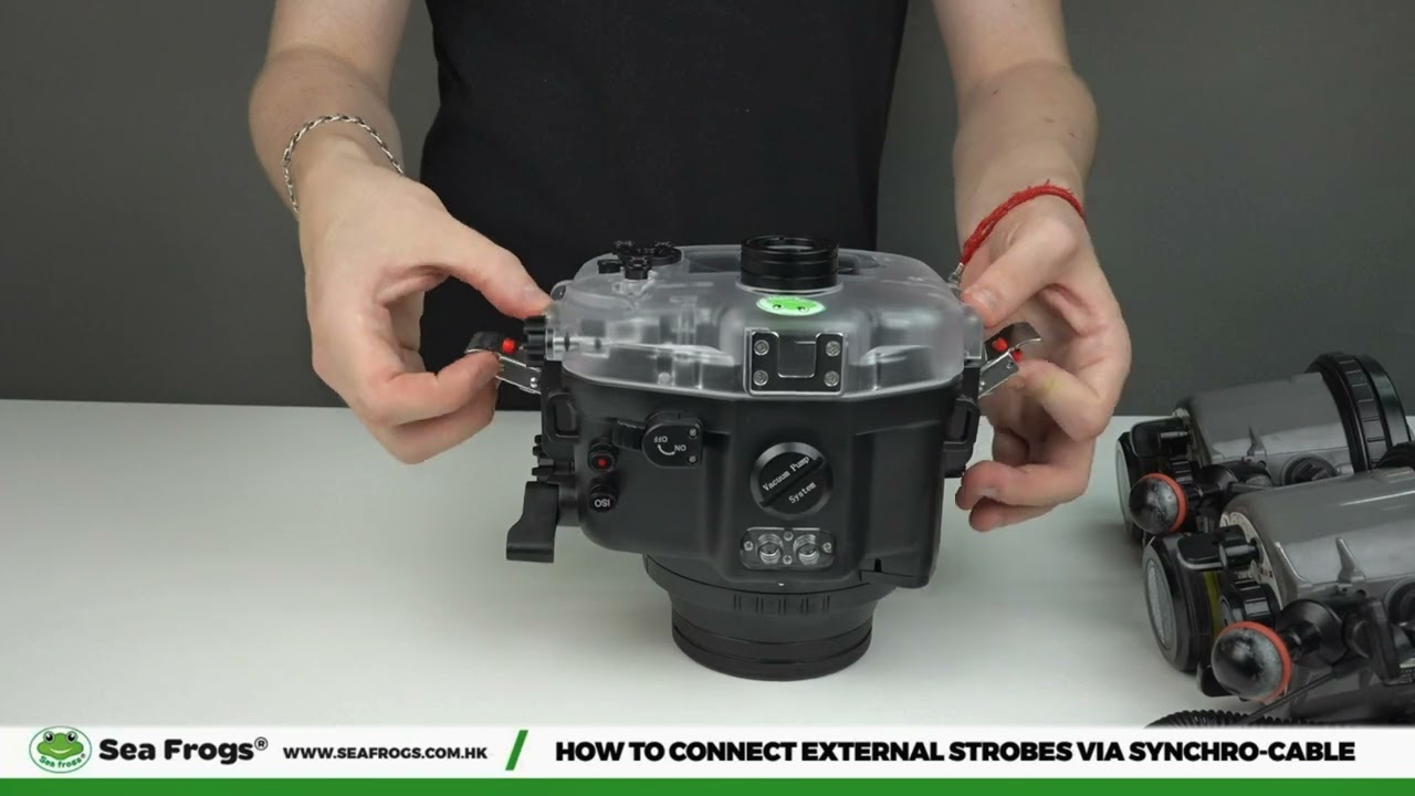 How to connect external strobes to the SeaFrogs Water Housing for the Canon EOS R50 camera.